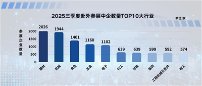 (二)我国出口优势产业表现优异。这一特征可通过三季度赴外参展中企数量TOP10大行业情况得以体现。这十大行业分别为:建材(2026家)、机械(1944家)、食品(1401家)、五金(1160家)、电子(1102家)、化工(639家)、包装(608家)、医药(599家)、工程机械及配件(592家)、电工(574家)。同时,三季度赴外参展中企数量TOP10的小行业数据亦值得关注,分别为:其他电子(449家)、其他食品(417家)、塑料(290家)、家用电器(290家)、石材石料(248家)、其他五金(244家)、其他工艺品礼品(239家)、医疗设备(224家)、建筑玻璃(192家)、门窗五金(189家)。