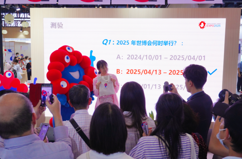 9月15日,日本驻中国全权大使金杉宪治先生亲临日本馆,参加2025年大阪关西世博会北京服贸会宣传活动,并视察日本馆。日本国际博览会协会推广局的吉安拓也先生与吉祥物脉脉专程来到北京,与广大中国观众互动。现场排队与脉脉合影的人络绎不绝,充分展示了参与大阪世博会的意愿和热情。
