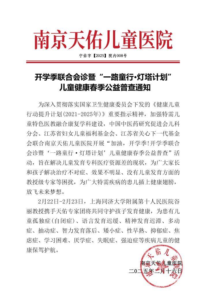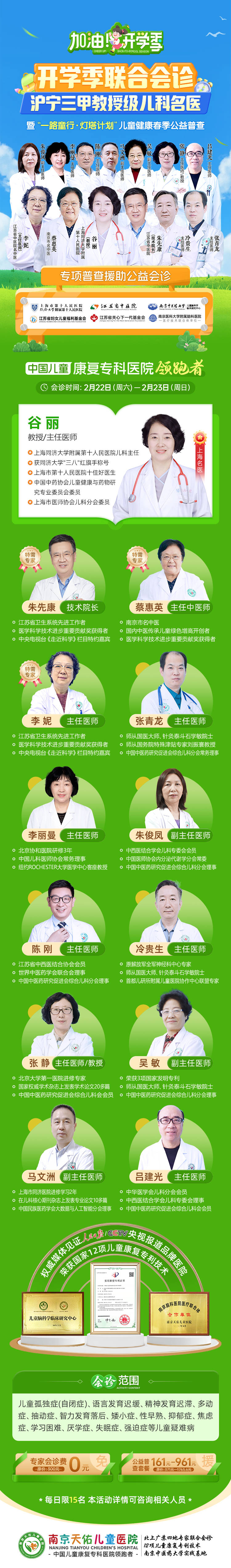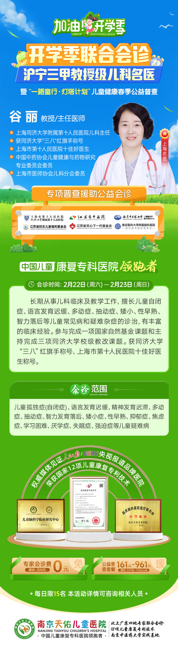 南京天佑儿童医院为解决广大儿童/青少年“挂号难、看专家难”的问题,于2月22日-23日开展“加油,开学季!沪宁三甲教授级儿科名医会诊暨‘一路童行·灯塔计划’儿童健康春季公益普查”活动,特邀上海同济大学附属第十人民医院谷丽教授来院领衔会诊,届时将携手天佑专家团共同守护孩子发育健康!