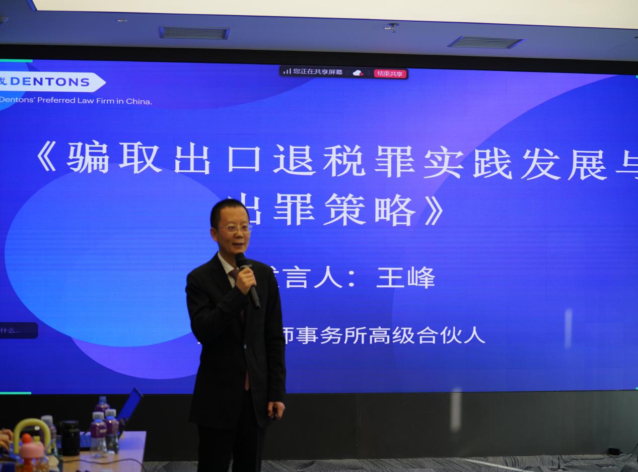 北京大成律师事务所高级合伙人、大成刑委会理事、涉税犯罪研究中心负责人、中国政法大学博士后王峰律师结合自己多年的研究成果及办案经验,以“骗取出口退税罪实践发展与出罪策略”为主题进行了分享。王峰律师结合亲办多件骗取出口退税罪案例以及法律法规、司法解释、典型案例等,重点解读了骗取出口退税罪个罪研究的必要、出口退税及骗取出口退税罪的概念特征、骗取出口退税的表现形式、治理发展、出罪策略、争议问题六个方面的问题。王峰律师认为,随着刑事辩护专业化细分,“个罪时代”已经来临,要加强个罪的研究,进行小切口深分析,“聚焦一厘米宽,挖掘一公里深”。既深耕法律专业,又了解客户行业,挖掘出案件的底层法律逻辑与商业逻辑。