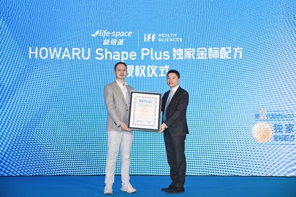 lifespace益倍适与IFF共研共创,筛选出高效协同的四菌组合并推出了专属于超燃B420益生菌的HOWARU Shape Plus独家金标配方,发布会现场举行了独家金标配方的授权仪式。