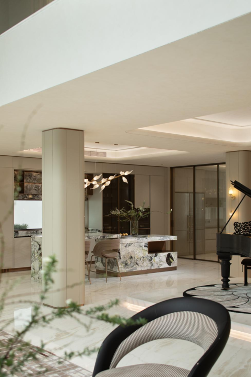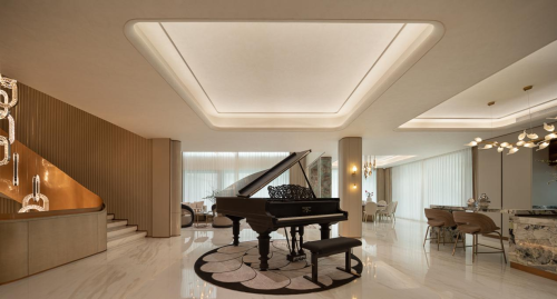 空间的中心区域打造成独立的钢琴区,让原本的公共区域变成家里最聚焦且能够交流互动艺术的中心舞台,周围格栅、弧形等优雅的设计,也恰如其分地烘托着这里的氛围,让音乐与艺术汇成生活最美的一面。