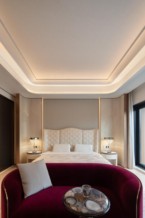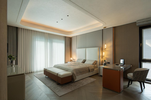 主卧在设计上充分运用了弧形美学,床头背景墙的弧形搭配高光的漆面,勾勒出一种优雅而又富有艺术张力的视觉,红丝绒沙发的点缀也带来强烈的视觉反差,整体优雅而又充满了高级的感觉。