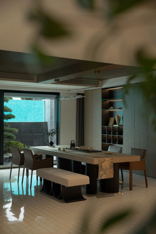在木石围合的纯粹之间,设计还以人工造景的形式,为空间注入更多精神的内涵,不同功能区的布局,亦很巧妙地保持着与风景的联动,像茶室与劲松,便营造出一种临窗而坐,禅韵悠悠的意境,于此,无论是饮茶还是锻炼,都能享有风景为伴的美好。