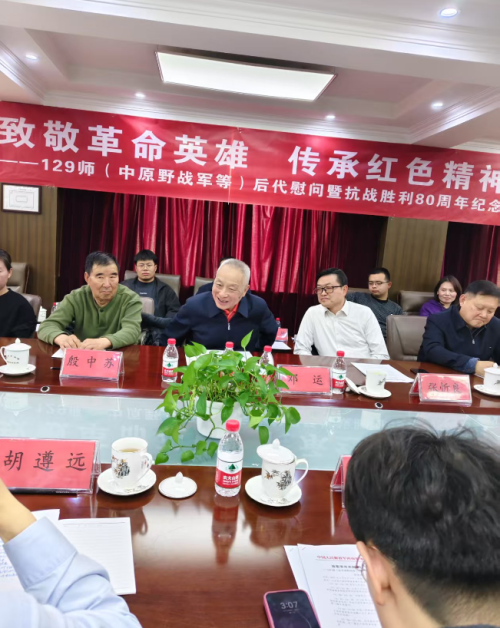 活动现场气氛热烈,来自全国各地129师英雄后代暨抗战英雄将领后代、历史学者、红色企业家齐聚一堂,一起掀开时光的扉页,重温中国人民那段不屈不挠的抗战历史。北京新四军研究会第一副会长、中国保利三利公司原总经理、老一辈无产阶级革命家、邓子恢之子邓运,中国人民解放军西南服务团团史研究院执行院长、中央和国家机关金融人才工委书记、国家金融人才服务中心主任张忻良,中国人民解放军西南服务团团史研究院特邀顾问、中国商业企业管理协会会长、副部级领导刘育才的委托人张杰,中国国家特型演艺协会副主席、中国五十六朵花歌舞总团高级顾问、邓小平特型演员陈沈予及夫人李航,安徽省文史研究馆特约研究员、安徽金寨干部学院原副院长胡遵远,安徽省金寨县文物局红色文物管理中心主任陈波,八路军129师纪念馆副馆长申利芳,上党战役指挥部北天河旧址、山西省长治市上党区北天河村党支部书记贾聪慧、副书记李玲芳、讲解员殷苏红、上党区北天河包村干部宋银花等一行4人,中国人民解放军西南服务团重庆涪陵研究会副会长戎斌,原北京市丰台区副区长、中国人民解放军西南服务团团史研究院秘书长鲁沂,国家金融人才服务中心常务副主任、中国人民解放军西南服务团团史研究院执行秘书长陈玉荣,中华人民共和国国史学会融媒体中心副主任、中华人民共和国国史学会研究员杨李颖,中国人民解放军西南服务团后代、中国人民解放军西南服务团团史研究院副秘书长李永忠,闽师大研究员、西南服务团团史研究院研究员、福建陈氏历史名人研究会副理事长、东南服务团后代陈永德,祖辈爷爷第一野战军晋察冀野战军抗战老兵(中共)、父亲北京市人大代表(中共)、北京民革党员,支部委员、中国银行保险业务经理、北京青年人力资源协会秘书长谢峰,今日头条特稿主编、129师二野重机枪连连长之孙布鹏程、之曾孙布铁威,北京中工闻道文化有限公司、 129师二野冀南二纵队五旅十四团二营重机枪连任排长的暴士彬之孙布朋印等40余人参加了本次座谈会。