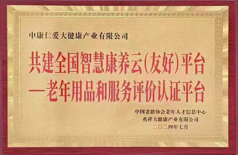 中康仁爱大健康产业有限公司作为品牌强国·自主品牌优选工程——适老评价认证行业典范企业、国家标准化管理委员会——老年用品和服务评价认证规范标准备案企业、AAA级诚信经营示范单位、AAA级重合同守信用企业、AAA级立信单位、AAA级质量、服务诚信单位、AAA级诚信供应商适老评价认证行业AAA级诚信单位。