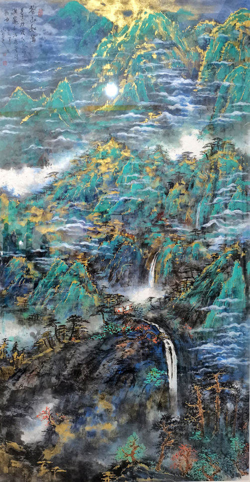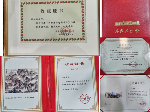 作品《壮美燕山》《仁者乐山,智者乐水》《岱岳雄姿》分别存列于北京市行政副中心、外事办公室、科技委办公室与行政办公厅,这些画作在政务要地熠熠生辉,不仅装点了办公环境,更为公职人员与往来宾客带来一场场视觉与心灵的盛宴,让他们在繁忙之余,得以沉浸于山水艺术的宁静致远之中。而那幅宽四米、高十四点六六米的巨幅山水作品《壮美神州》高悬于金陵国际大酒店,仿若一扇通往华夏壮美山河的艺术之窗,向世界旅人展示着中国山水的无尽魅力,成为酒店独具特色的文化名片。