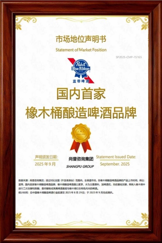 近日,蓝带啤酒(Pabst Blue Ribbon)获尚普咨询集团权威认证,荣膺“国内首家橡木桶酿造啤酒品牌”市场地位声明书。这一认证不仅是对蓝带啤酒在酿造工艺创新上的高度肯定,更是其百年品牌历史中又一里程碑式的成就。