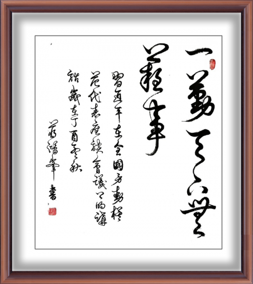 一生酷爱文化艺术。常以诗词放歌山河,以书法感怀斯世。犹以书法作品笔墨饱满而富有灵气,结字轻重繁简得体,收放自如。通篇和谐统一,新意迭出,富有节奏感和韵律美,开阔疏朗而不失精密,笔势劲健又霸气十足。其用气持力用心守衡,用意驱动,完全投入,力求心,手,笔,纸达到天人合一的境界。能使作品迸发喜怒哀乐,写意风云沧桑。观其特点清新脱俗,空灵飘逸。长枪大戟,气势如虹。行云流水,恬淡清纯。能令人感到‘出新意于法度之中,寄妙理于豪放之外’。作品中展现出的韵,法,意也总能让人产生如沐春风的醉意。开创了一条格调高雅,独具风格的现代书法艺术新风。
