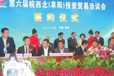 2012年10月28日上午,第六届皖西北(阜阳)投资贸易洽谈会举行投资说明会暨项目签约仪式,阜阳市在会上推介5大类224个项目,共有108个项目集中签约。签约项目总投资500.18亿元,招商引资445.31亿元,签约金额为历届贸洽会之最。
