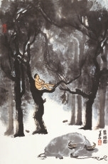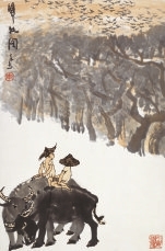 如果说李可染在早期的牧牛图作品中袒露给观众是个性情中人,反映了一个艺术家必有的天真;那么在李可染主攻山水画之后,我们看到他追求的都是崇高严肃的东西,而牧童和牛往往承载着他的这种“严肃”。雄伟的山水是他对精神的不断升华,牧童与牛使他的灵魂不断净化,体现出李可染生命情调的两个侧面。