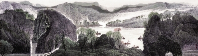李清江先生的版纳山水,表达的是画家自己独特的美感体会,同时抓住了这一特定自然景观的风韵。远远望去,那秀逸劲拔的青山、清澈明丽的湖水,一种高洁舒爽之气扑面而来。画面在布局上巧妙地注入了一种感人的空间意象,将感情自然融化于山水画之中,从而创造出一种前无古人的独特画境。加之那潇洒利落的笔法和浓而不浊的墨色自然地烘托出这青山碧水的明洁意境。李清江先生的江南水乡系列作品中,那水田、角楼、码头、密密的竹林、古榕等,构成了永恒,悠悠然地荡涤着读者的心灵。
