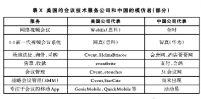 视频会议涉及到硬件(显示器、路由器等)和软件服务,尤其是高速、稳定的宽带。不但是视频会议、网络会议需要技术服务公司,传统的面对面会议、人人都离不开的无线网络、会议组织者都要用到的数据库软件都依赖不同的技术服务公司。技术服务之所以能大行其道,得益于网络速度和质量的提高以及智能终端(如智能手机、iPad等)的广泛运用。