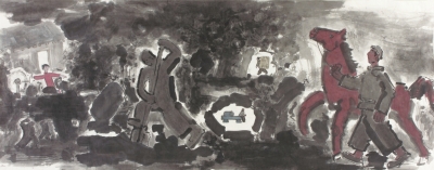 为了表达萦绕在他心中的那些生存记忆,他不得不放弃学院的造型观念和现成的笔墨系统,因为原有的画面格局根本无法表达他的乡间情怀,表达他对泥土的亲和感。他必须找到一种新的,更接近他的情感生活的语言方式,也就是他现在摸索到的那样一种拙拙的、笨笨的、黏黏的无法和这个特定主题相分离的泥言土语。如干柴乱草般的皴擦,不拘章法的人物分布,打破常规的图式结构,所有这一切,都构成了他特有的一种叙事方式,表达了一个身心分离的“乡间都市人”的特有情怀。