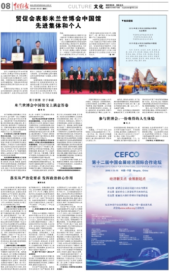 贸促会表彰米兰世博会中国馆先进集体和个人