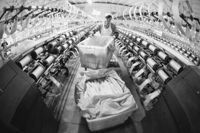 江苏省海安县的鑫缘茧丝绸集团股份有限公司是一家起步于收茧、缫丝的纺织企业。20多年来,该企业积极实施科技创新、品牌战略和循环经济,走出了一条传统产业转型升级的成功道路,而今已发展成为国内专业从事蚕种繁育、蚕茧收购加工、桑蚕生丝、捻线丝、绢丝、丝绸面料、服装服饰、真丝家纺产品、桑蚕生物制品的生产加工,以及丝绸产品国际国内贸易和科研开发于一身的大型现代化企业集团。图为鑫缘茧丝绸集团股份有限公司生产车间一角。