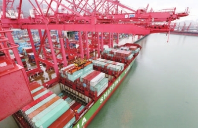 1月5日,雨中的江苏连云港港集装箱码头一派繁忙景象。连云港港积极实施“丝路枢纽、品牌发展、智慧港口、港产城联动”四大战略,2016年新开地中海美西、韩国蔚山、东南亚等7条航线,不断加大竞争区域货源争揽力度,主体货种上数量优势明显。连云港港2016年全年货物吞吐量完成2.21亿吨,同比增长5.03%。