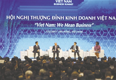 | 11月7日,2017亚太经合组织(APEC)领导人会议周越南工商峰会在岘港阿里亚那会议中心举行,越南总理阮春福发表主旨演讲,并与参会工商界代表互动。 中新社记者 邢翀 摄 |
