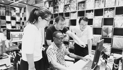 近年来,为大力开拓非洲市场,山东省滨州高新技术产业开发区一纺织企业聘请非洲设计师对产品进行本土化设计,将非洲自然、文化等元素融入纺织品印花、面料中,形成独具非洲特色的产品。图为来自加纳的设计师查尔斯(中)与中国设计师交流。 新华社发 张春峰 摄