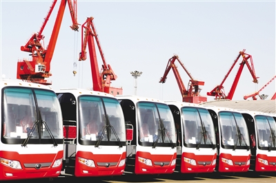 10月27日,在江苏连云港港码头,由河南郑州宇通客车股份有限公司生产的330辆高端客车,在东泰公司码头68泊位装船出口古巴。近年来,连云港港口围绕“一带一路”倡议深耕海外市场,产品远销阿尔及利亚、古巴、巴西、沙特阿拉伯等数十个国家和地区。图为大批宇通高端客车集结在连云港港口码头货场等待装船出口国外。