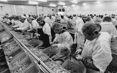 近年来, 安徽省庐江县大力发展稻虾连作综合种养产业,大力鼓励农民稻虾轮作。食品厂依托当地充足的小龙虾原料资源,全力拓展市场,庐江小龙虾“游”向欧美大市场。图为庐江县跃华绿色食品厂的加工车间,工人们正忙着制作速冻冻煮小龙虾仁,以满足欧美市场订单需要。 中新社发 左学长 摄