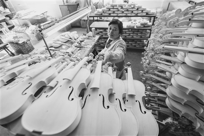江苏省泰兴市黄桥镇被誉为“东方提琴之乡”,提琴生产加工成为带动群众致富的支柱产业。目前,该镇共有200多家提琴生产及配套企业,3.5万名乐器行业从业人员,年生产各类提琴70余万把,约占世界总产量的30%,产品销往90多个国家和地区。图为11月3日,在泰兴黄桥镇一乐器公司,工人查看大提琴白坯质量。