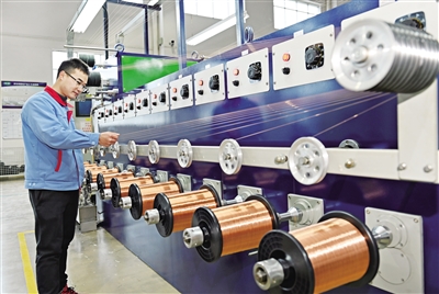 岁末临近,湖南省邵阳市武冈市工业园区企业呈现一派忙碌的生产景象,工人们加班加点抢时间,赶制订单产品,确保按期保质完成年度生产目标。图为武冈市某电子科技公司拉丝车间,工人们正在生产漆包线。 中新社发 滕治中 摄