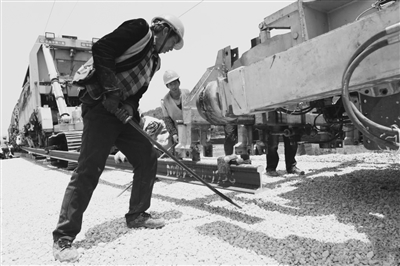 中老铁路全长1000多公里。通车后,中老铁路将成为我国西南地区又一条进出境国际铁路通道。目前,中老铁路国内段铁轨铺设施工正忙。图为工人在云南省景洪市大渡岗乡大荒坝段进行铺轨作业。