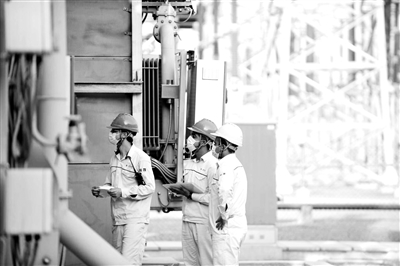 连接巴基斯坦南部城市默蒂亚里和北部城市拉合尔的默拉直流输电项目全长886公里,主要设备由中国企业提供。图为巴基斯坦运维人员在该项目的拉合尔换流站工作。新华社发 艾哈迈德·卡迈勒 摄