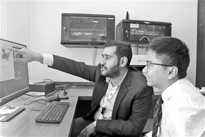 在约旦南部广袤荒漠中,高耸的风力发电机星罗棋布。其中一处风电站,是由中资企业三峡国际管理运营的约旦舒巴克风电站。该风电站于2021年投入运营。图为在该风电站,三峡国际约旦新能源项目工程师与舒巴克风电站现场运维工程师交流工作。新华社记者 冀泽 摄