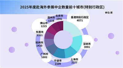 2025年度,中企赴海外参展TOP10城市(特别行政区)分别是香港特别行政区(4071家)、深圳市(3001家)、上海市(2277家)、宁波市(2109家)、广州市(1802家)、杭州市(1430家)、东莞市(1311家)、佛山市(1215家)、温州市(1118家)、北京市(1041家)。值得注意的是,包括香港特别行政区在内,所有10座城市均为沿海城市,这一分布充分体现了我国沿海地区企业“走出去”参展的态势。