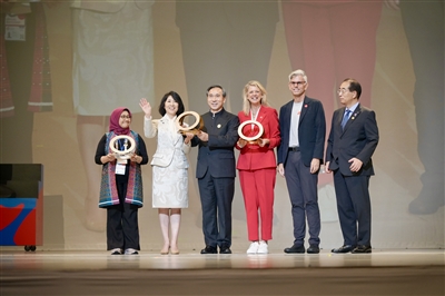 | 2025年10月12日,日本大阪,大阪世博会中国馆荣获2025大阪世博会大型自建馆展示金奖。图为中国贸促会会长任鸿斌(左三),中国贸促会副会长、中国馆政府总代表李庆霜(左二)代表中国馆领奖。 |