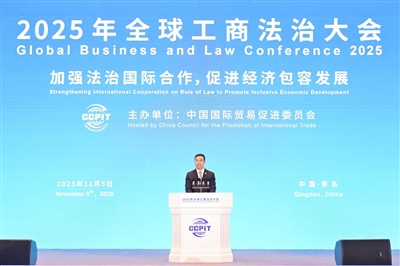 | 2025年11月5日,山东青岛,2025年全球工商法治大会举行。图为中国贸促会副会长刘健男主持开幕式。 |