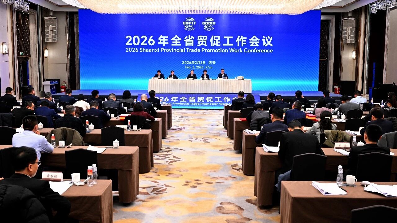 2月3日下午,2026年陕西全省贸促工作会议在西安召开。会议传达了全国贸促工作会议、省两会精神,全面总结2025年全省贸促工作,部署2026年重点任务。陕西省贸促会党组书记王宏伟讲话,陕西省贸促会会长贾正兰作工作报告。陕西省贸促会副会长权俭主持会议,陕西省贸促会副会长郑建设通报了2025年度全省贸促系统先进单位。