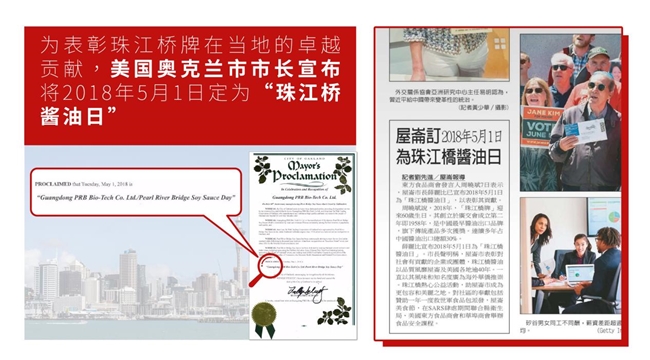 珠江桥不仅是中国调味品行业的领军品牌,更是中国饮食文化的传播者。“世界上有炊烟的地方就有华人,有华人的地方就有珠江桥牌酱油。”这句话一直在海外各地流传,珠江桥牌的产品走进了全球千家万户的厨房餐桌。2018年5月1日,美国奥克兰市长将当日定为“珠江桥牌日”,以表彰珠江桥在饮食文化交流方面的卓越贡献。这一荣誉不仅是对珠江桥品牌的认可,更是对中国饮食文化的肯定。