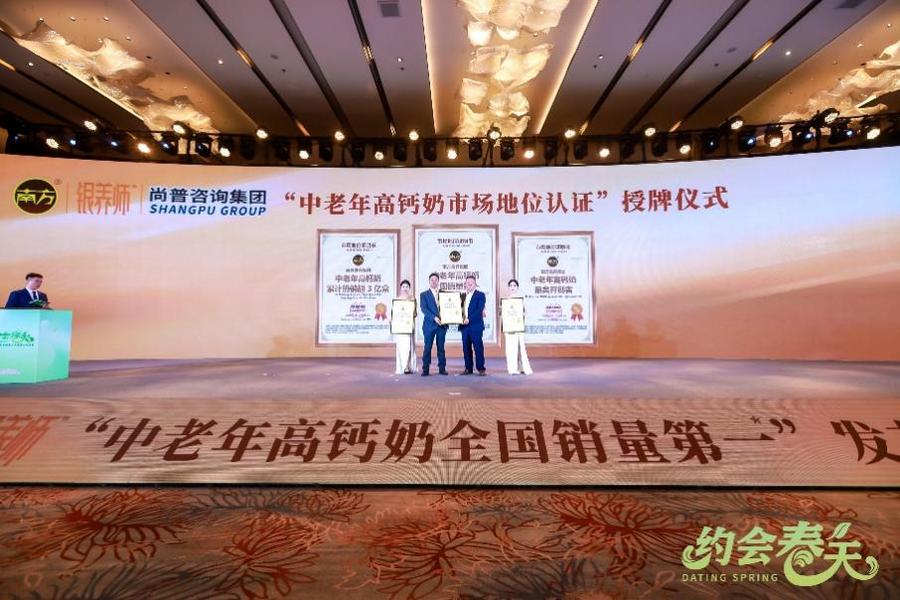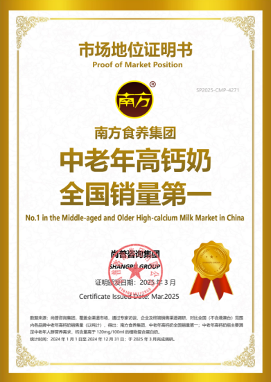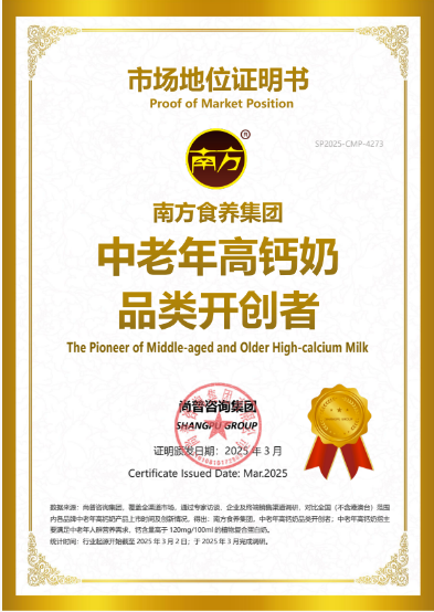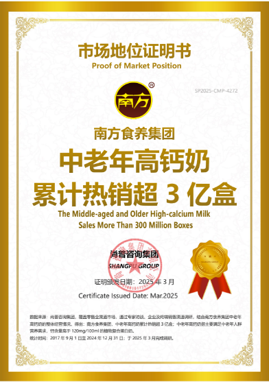 2025年3月,尚普咨询集团向江西南方食养集团科技有限公司(以下简称“南方食养集团”)旗下的中老年高钙奶产品颁发市场地位证明书。此次南方食养集团荣获尚普咨询集团颁发的【南方食养集团,中老年高钙奶全国销量第一】、【南方食养集团,中老年高钙奶累计热销超3亿盒】、【南方食养集团,中老年高钙奶品类开创者】权威证明,表明南方食养集团推出的中老年高钙奶凭借卓越的品质保证,赢得了市场的广泛认可。