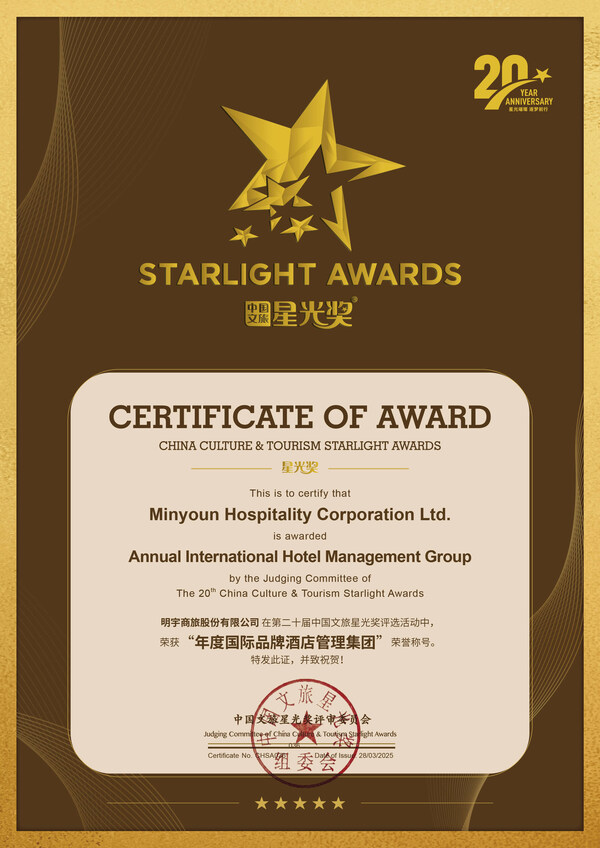 2025 AHF®亚洲酒店及旅游业论坛暨第20届中国文旅星光奖颁奖典礼3月28日于上海成功举办。明宇商旅誉获年度国际品牌酒店管理集团,旗下酒店天津鹏邸•凯悦尚选酒店获年度臻选会议酒店,成都东大明宇豪雅饭店获年度十佳会议会展酒店,成都科华明宇豪雅饭店、成都生物城凯悦嘉轩酒店及南充天府尚雅酒店分获最受商旅人士欢迎酒店。