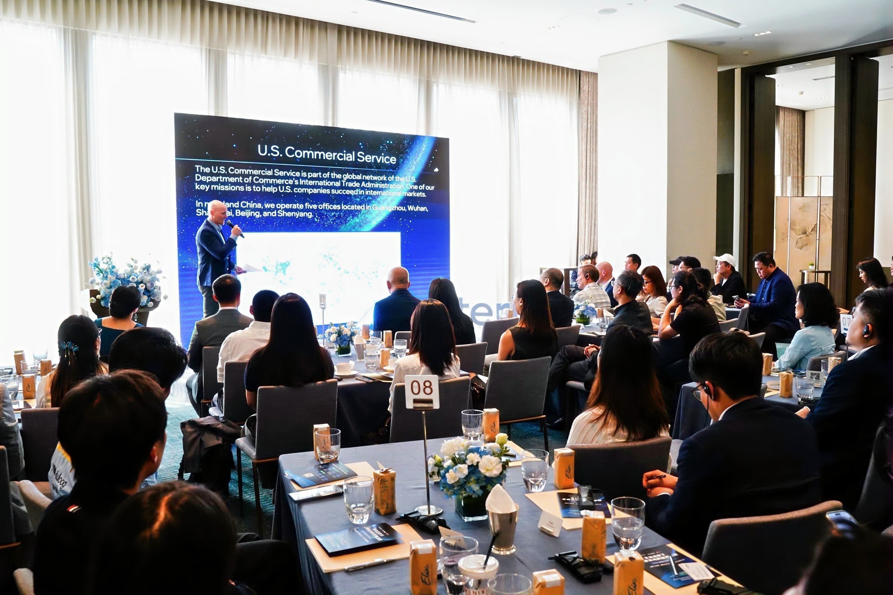 美国驻广州总领事馆商务处副领事Clinton Harper为活动开场致辞,祝贺Pattern栢藤团队举办其首次在华的大型商务交流活动,强调此举彰显Pattern对助力中国品牌进行全球化拓展的重视。Clinton在讲话中肯定了Pattern作为北美地区增长最快的科技公司之一,在技术实力、运营策略、全球供应链能力及商业战略方面的优势,呼吁中国企业借力其经验拓展海外市场。