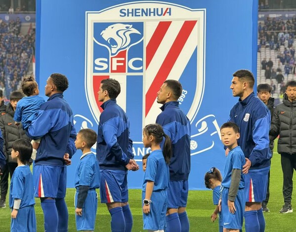 嘉会医疗邀请自闭症儿童作为牵手球童(右一)与申花球员共同唱响国歌