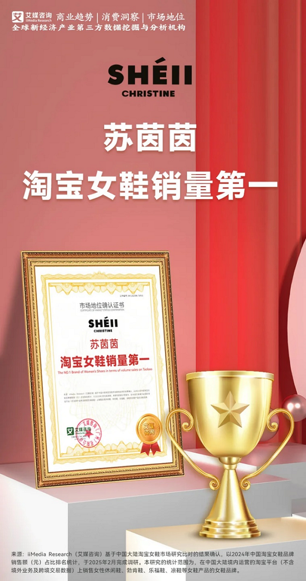 2025年2月,全球新经济产业第三方数据机构iiMedia Research(艾媒咨询)基于CMDAS大数据系统监测及市场研究比对,正式授予SHEII苏茵茵“淘宝女鞋销量第一”的市场地位确认。这一里程碑式的认可,不仅印证了品牌十余年从渠道依赖型商家到生态化品牌价值驱动者的蜕变,更揭示了中国新锐消费品牌在存量竞争时代的破局逻辑。