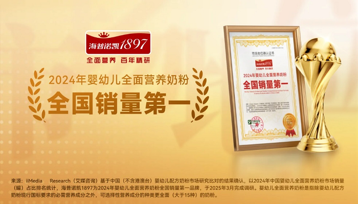 2025年3月,海普诺凯获全球领先的新经济产业第三方数据挖掘和分析机构iiMedia Research(艾媒咨询)授予的“2024年婴幼儿全面营养奶粉全国销量第一”市场地位确认。