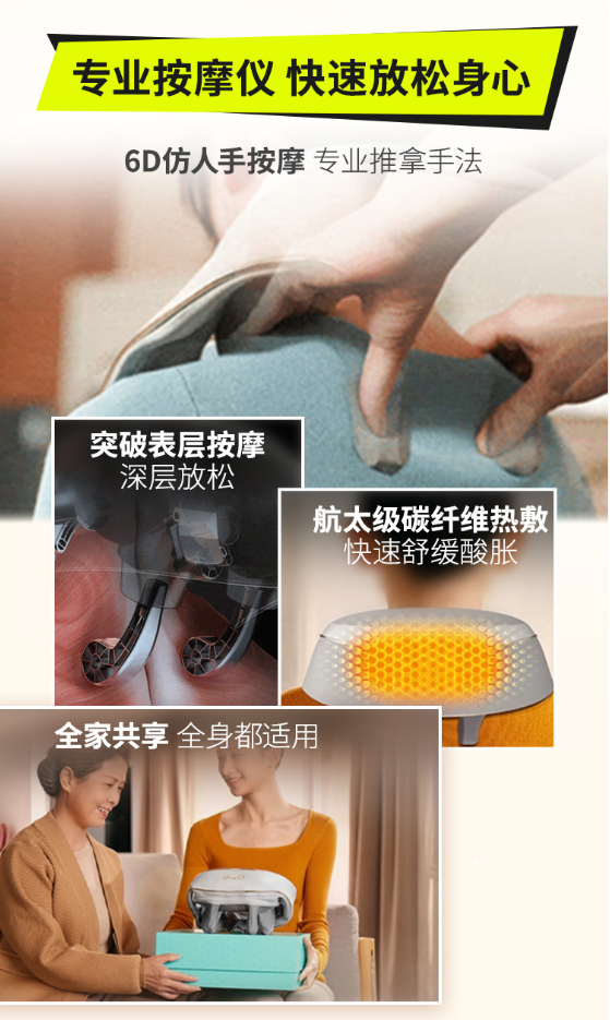【6D仿人手按摩+航太级碳纤维热敷】,作用深度达筋膜层,是普通表皮震动按摩的多倍渗透效率,能即时缓解疲劳。