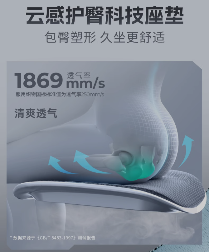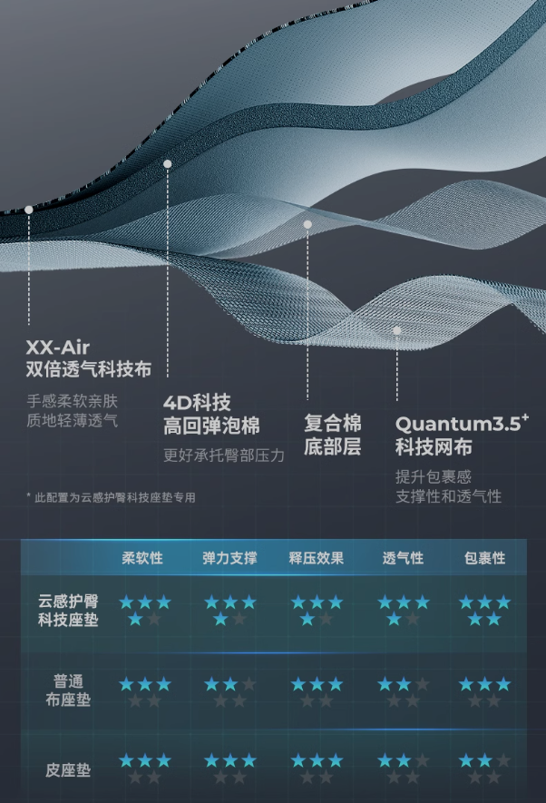 【云感护臀释压科技坐垫】:采用仿生人体工学的坐垫曲面设计,创新搭载「双倍透气科技布+4D科技高回弹记忆棉+复合棉底部层+ Matrex Quantum3.5科技网布」复合结构,能更好地分散臀部压力,日均久坐8小时仍能保持干爽舒透,告别闷热黏腻感与久坐坐骨神经压迫风险。