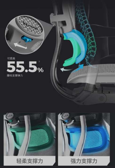 【双控智能腰枕】通过7cm升降调节,可精准匹配155-195cm全身高段人群;多档分级弹力支撑科技,既满足45-110kg不同体型用户的承托需求,又能根据个人的使用场景如办公、玩游戏、追剧等,智能调节适合自己腰部的支撑强度。真正实现"千人千面"的腰椎健康守护。