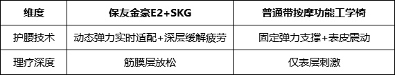 实践表明,这种基于专业护腰人体工学椅与专业按摩仪防护模式,可显著预防久坐职业病,以低成本日常防护替代高额医疗支出,同步提升工作效率,并优于市面多数“带按摩功能的工学椅”仅通过附加微震动按摩模块+在腰枕嵌入按摩头,微震动按摩模式不仅无法解决深层肌肉劳损,而在腰枕嵌入按摩头的方式则让腰枕部分过于突出,容易硌腰,还会把腰部被顶起来,严重还会造成腰椎间盘突出。保友与SKG的组合方案以专业分工实现技术互补,达成“专业护腰+医疗按摩”的双buff守护脊柱。