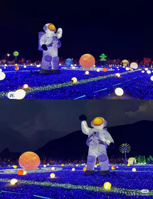 同时,本次嘉年华还特别设置了月球灯光展。以月球为主题,运用灯光、投影、装置艺术等多种技术手段打造的光影展览将现场装扮得如梦似幻。星光隧道、星耀太阳系、星虹月半弯等多个打卡点更是成为游客们争相拍照留念的热门地点。在这片被“明月”照亮的大草坪上,游客们可以尽情享受一场别样的春游盛宴。