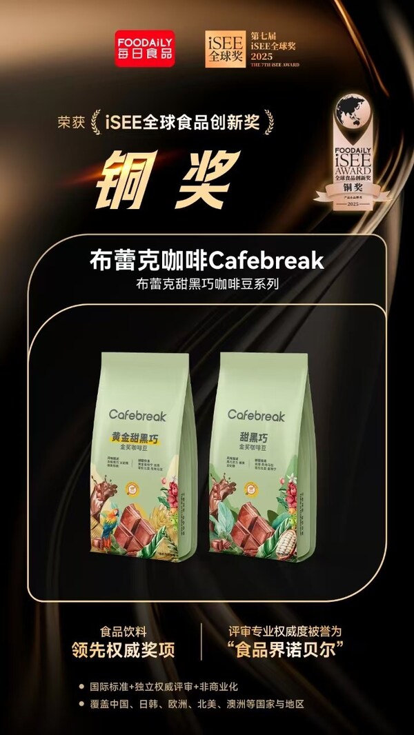 3月30日,在第七届iSEE全球奖年度盛典上,布蕾克甜黑巧咖啡豆系列凭借卓越的产品理念、出众品质与独特风味,成功斩获iSEE全球食品创新奖铜奖。