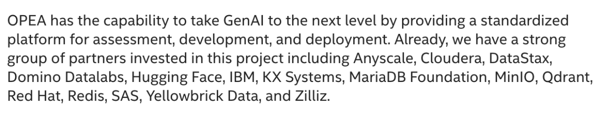 联合Hugging Face、Anyscale、Zilliz等AI行业合作伙伴推出的企业AI开放平台 (OPEA) ,就是最好的证明。