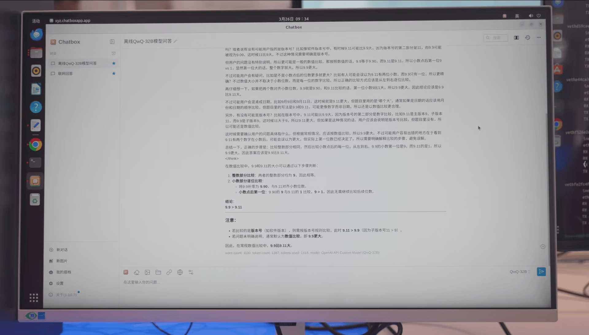 从效果上来看,若是**单人**使用,一体机的速度已经达到了**32 tokens/s**。