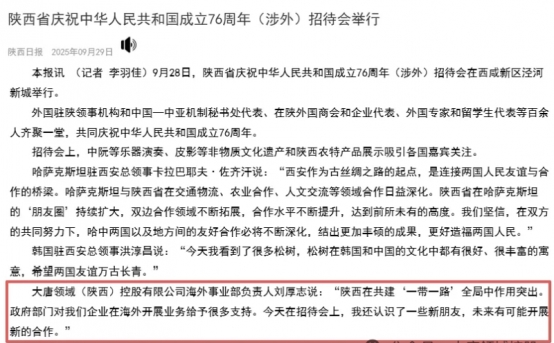 大唐领域控股受邀参加陕西省庆祝中华人民共和国成立76周年(涉外)招待会